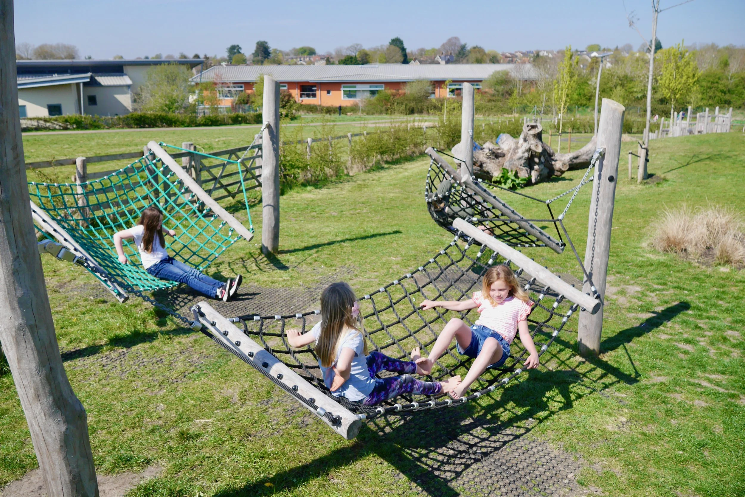In addition to the formal seating options, natural elements, such as boulders and oak logs were used to create informal seating that blended seamlessly into the playscape and double up as playful elements. The sloping typography of the site creates natural places to sit and open areas of grass encourage picnics. A trio of hammocks provide a playful hangout area and a stage creates a space for both performance and informal seating.